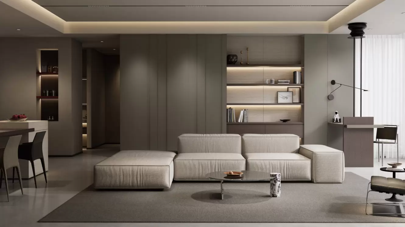 Moderne woonstijl benadrukt smaak in details. De kleurencombinatie van de woonkamer is harmonieus, met een lichtgrijze metaaltextuur en donkerbruine houtkleur die elkaar aanvullen, en een vleugje rode accenten, dynamisch maar toch stabiel.