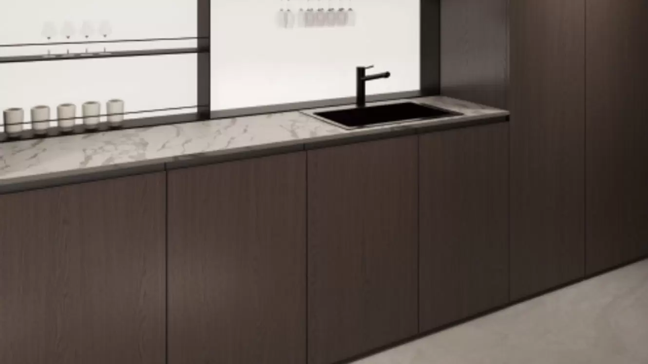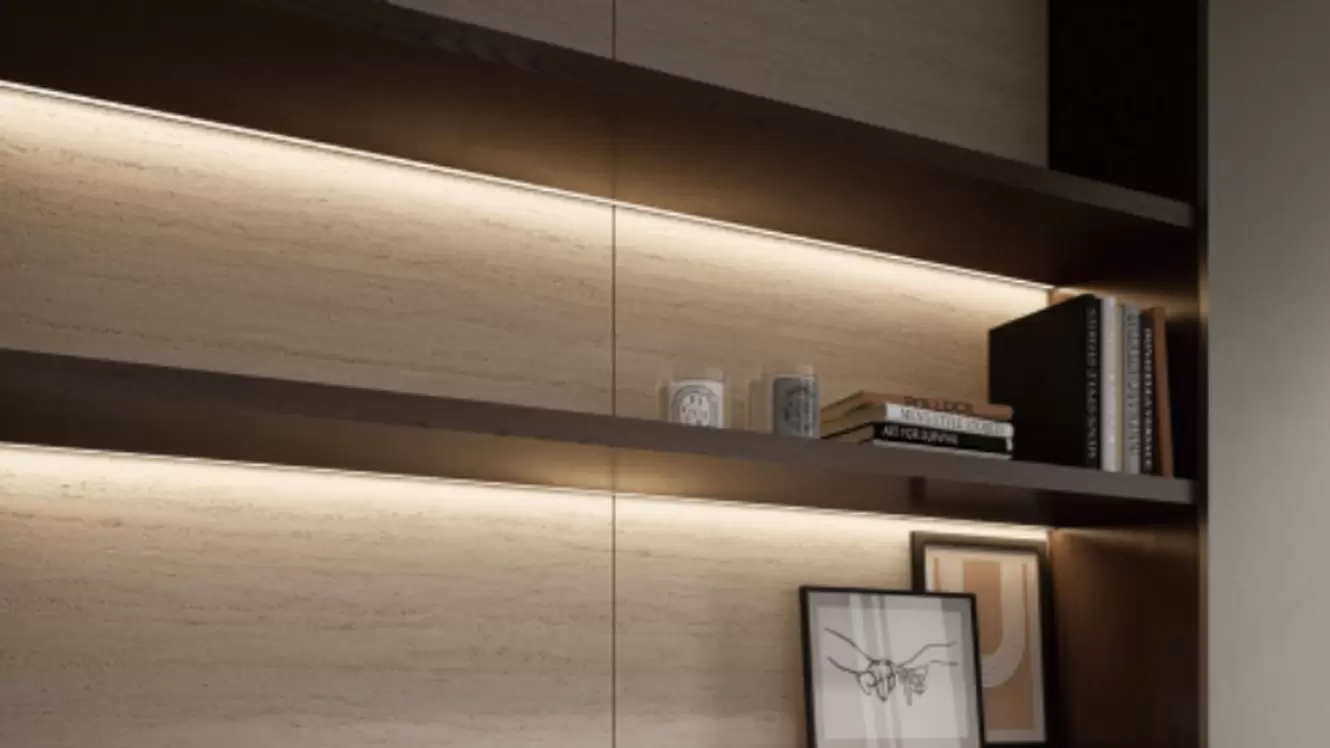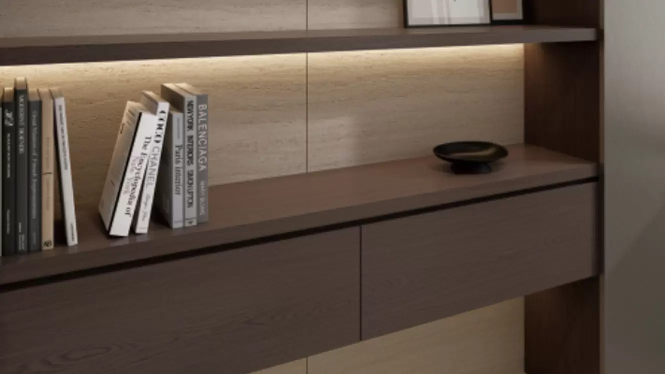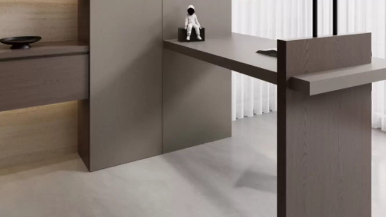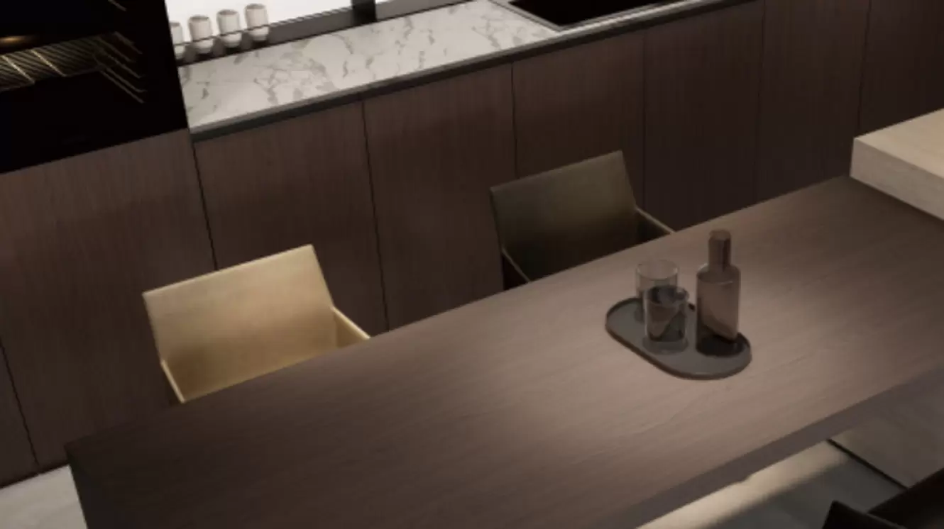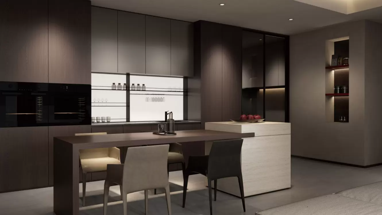 Achter de schuifdeur met pianotoetsen, die als springende noten over de vloer schuiven, ontstaat een artistieke sfeer. Het balkon is slim uitgerust met een bureau, waardoor een rustige lees- en werkruimte ontstaat te midden van het bruisende stadslandschap. Het lichtbeige steenpatroon op het kookeiland contrasteert met de omringende donkere kasten. De boekenkast in de woonkamer is voorzien van een lichtstrip, die boeken en ornamenten met zacht licht verlicht en zo een artistieke sfeer creëert. In het restaurantgedeelte is onder het bedieningspaneel een lichtstrip geïnstalleerd om de kookruimte te verlichten en de bediening te vergemakkelijken.