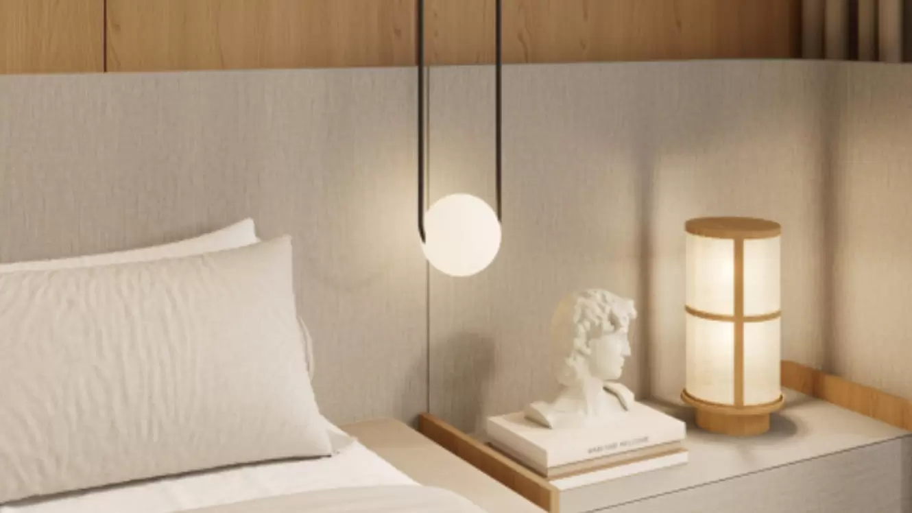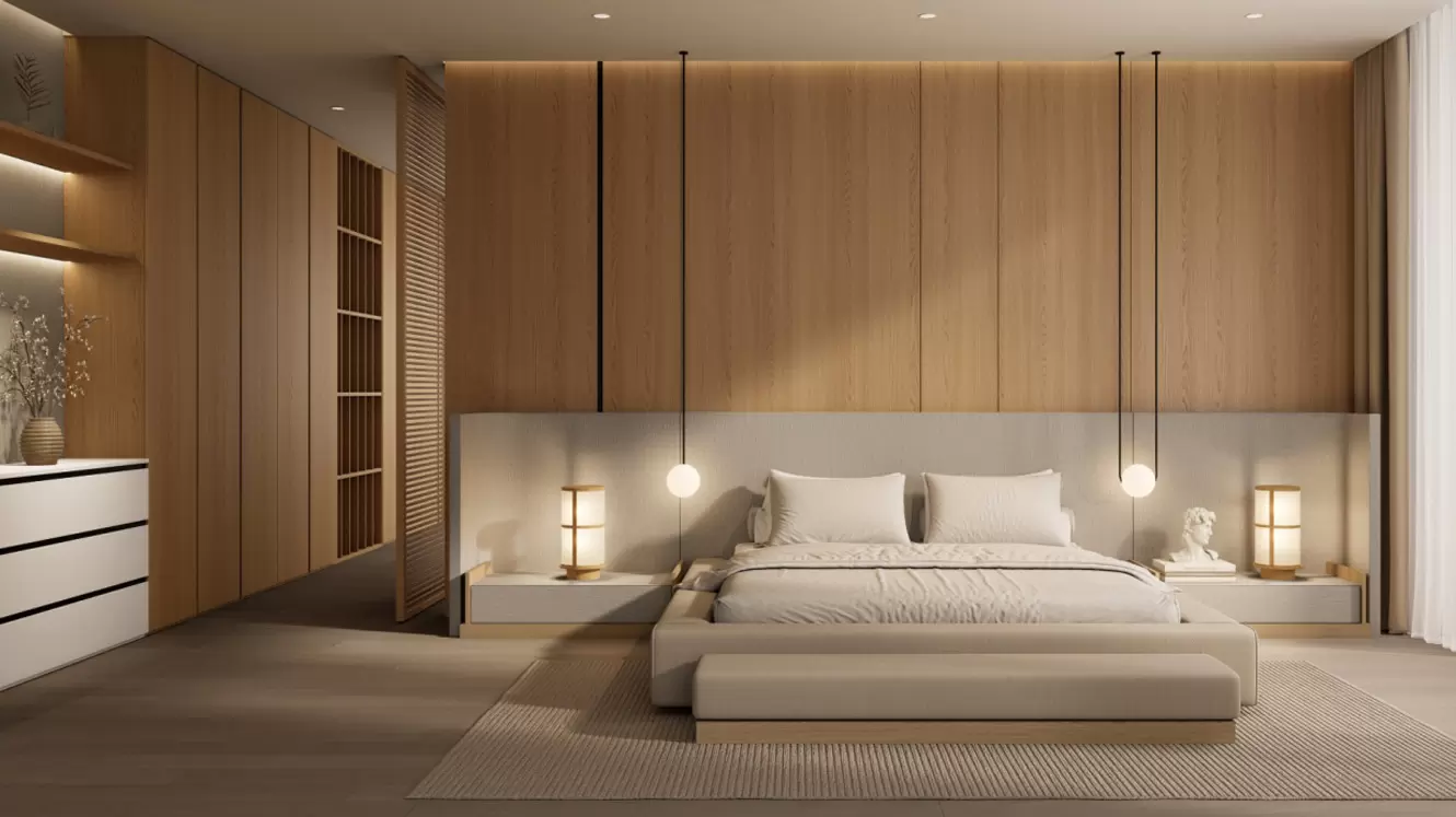 Bij binnenkomst in de slaapkamer valt meteen de unieke, gebogen achtergrondmuur op, met zachte rondingen die de ruimte levendigheid en elegantie geven. De kledingkast aan de linkerkant heeft niet alleen krachtige opbergmogelijkheden, maar dient ook als hoek van de boekenkast, waardoor je gemakkelijk bij je favoriete boeken kunt. Achter de off-axis roosterdeur bevindt zich een eigen kleedkamer. De witte elementen, het lichtbeige beddengoed en de gordijnen vullen elkaar aan, en onder de zachte verlichting is de hele slaapkamer vredig en comfortabel, alsof het een natuurlijk toevluchtsoord is in de lawaaiige stad, waardoor mensen zich volledig kunnen onderdompelen in deze warme en comfortabele sfeer.