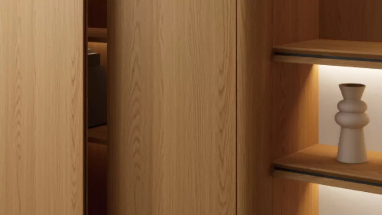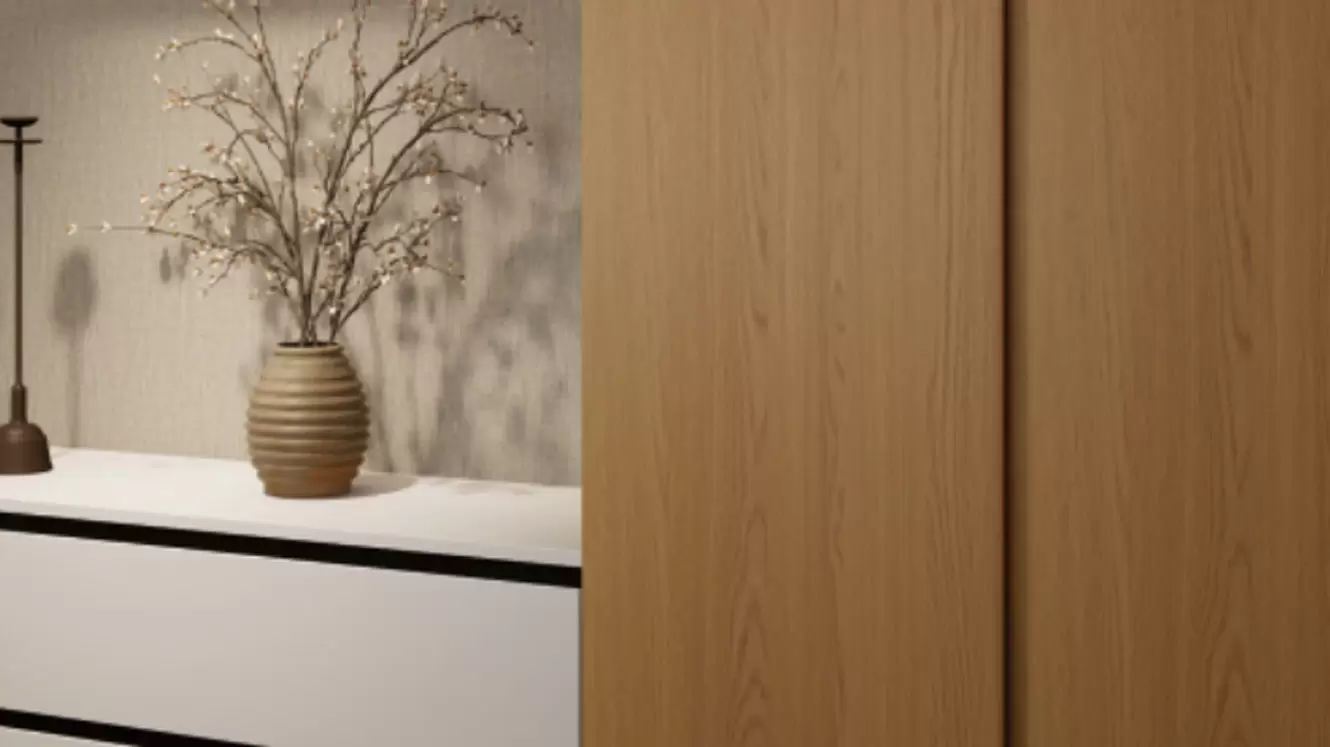 De natuurlijke houtstijl van Meiju ontmoet comfort in de natuur. Met Californisch rood eiken als kern, gecombineerd met elegant wit, licht linnen en een textuur van grotsteen, is het eenvoudig maar dynamisch.