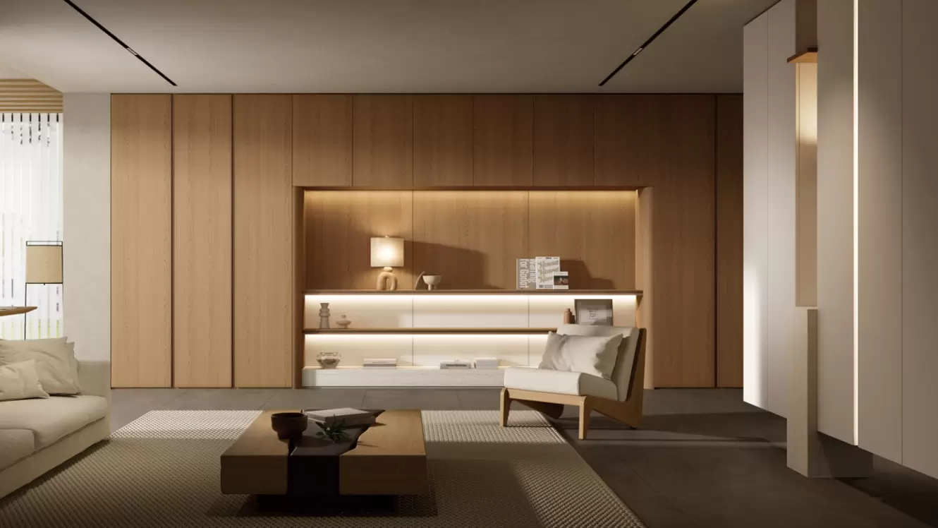 Bij binnenkomst in de woonkamer valt het oog op een grote ruimte met kasten van Californisch rood eikenhout, die zowel praktisch als voorzien van aardgas zijn. De kast aan de rechterkant van de woonkamer is uniek ontworpen en dient zowel als schoenenkast als scheidingswand. Hij bergt niet alleen schoenen op, maar verdeelt de ruimte ook slim. Het gedeeltelijke ontwerp van Yabai accentueert het geheel en vormt een aanvulling op de lichte linnen bank en de deken, wat een warme sfeer creëert. De schaduwelementen van rotsporiën zijn vaag zichtbaar en geven de ruimte een vleugje diepte. Het warme licht valt naar binnen, waardoor mensen zich bij binnenkomst al ontspannen voelen.